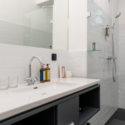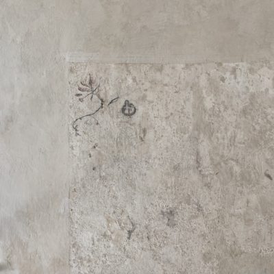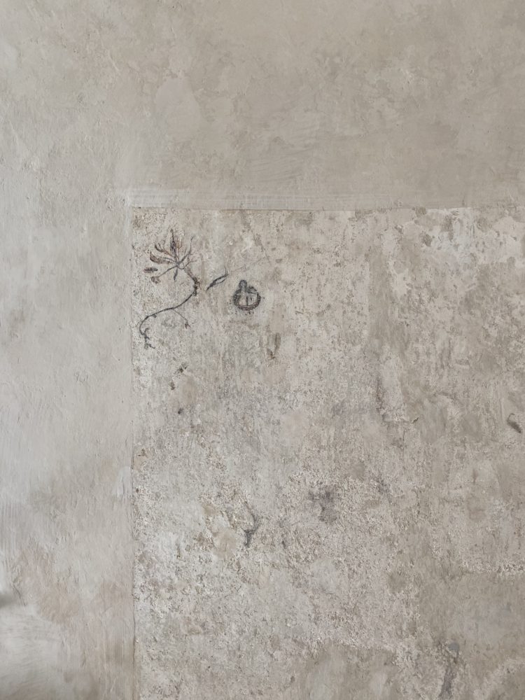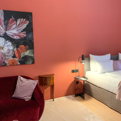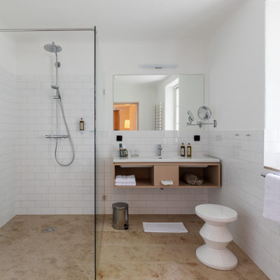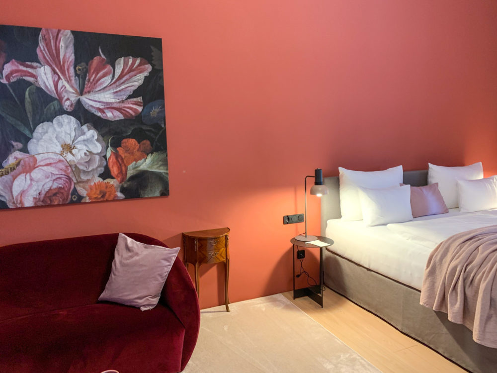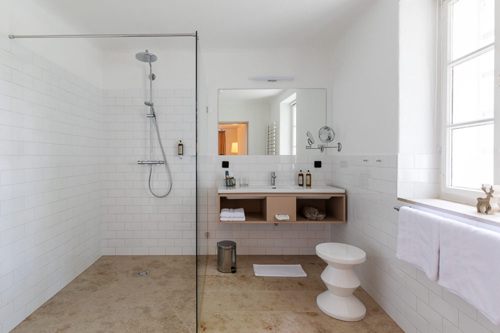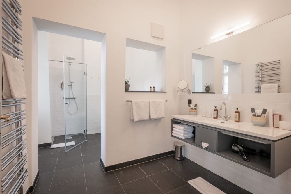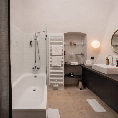Ca. 55m² suite. Located above the imposing chimney flue of the former castle kitchen, the dimensions can be envisaged based on the impressively slanted fireplace walls. A magnificent symbiosis of historically listed, restored murals and the elegant signature-design of POLKA. Beautiful salon facing the arcaded walkway and a separate bedroom overlooking the Arboretum. Semi-open bathroom with bathtub.