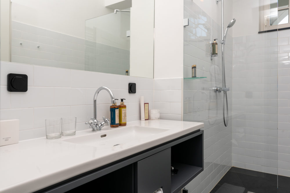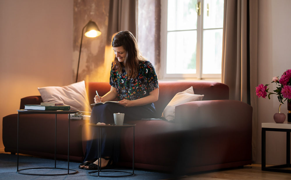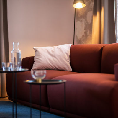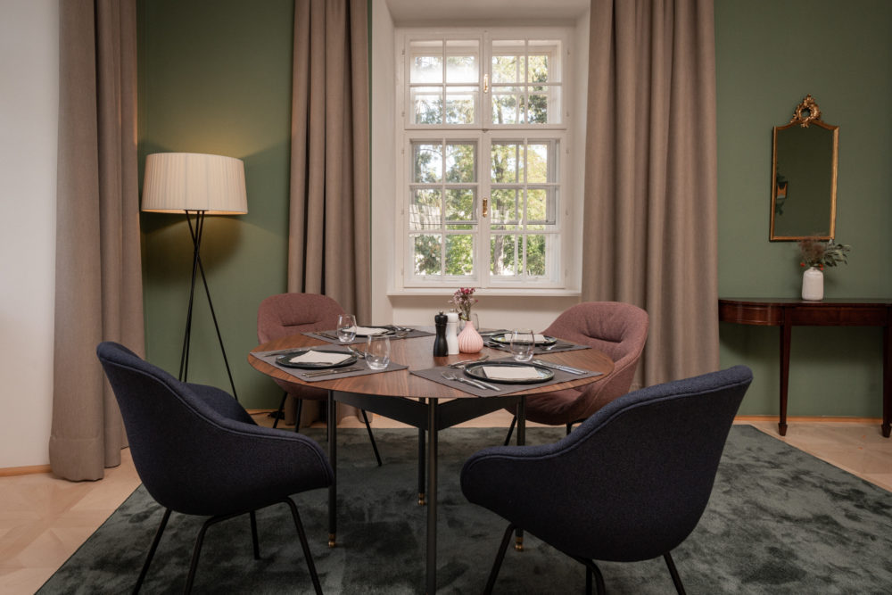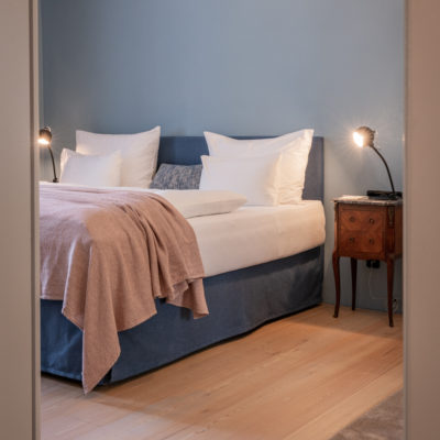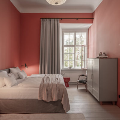 Ca. 65m² suites with 2 separate bedrooms. Self-assured color and wallpaper themes coupled with restoration of historically listed elements. Timeless furnishing design curated by POLKA, on long, roughly textured spruce floorboards. Perfect rooms for families or friends.